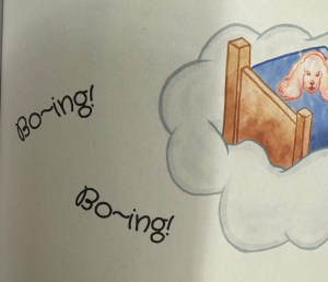 One other thing, the book is dotted with the work “Boing”. I think it’s the grandfather clock chiming, but I would have described that as a “tock” or “dong” or “bong” perhaps. Boing sounds bouncy to me, which doesn’t make sense. Plus there is a dash in the middle of the word, so it is written “Bo-ing” and EVERY time I saw it, I read it as “Boring”. Ooops! Is that just me?