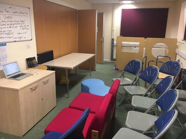 All quiet – waiting for 120 pupils to come back after lunch at Ellingham Primary School for a fun author visit.